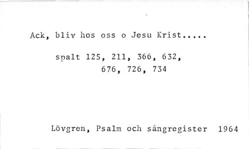 //// Ack, bliv hos oss o Jesu Krist //// spalt 125, 211, 366, 632, //// 676, 726, 734 //// Lövgren, Psalm och sångregister 1964 ////