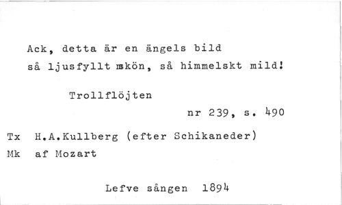 //// Ack, detta är en ängels bild //// så ljusfyllt iskön, så himmelskt mild: //// Trollflöjten //// nr 239, s. 490 //// Tx H.A.Kullberg (efter Schikaneder) Mk af Mozart //// Lefve sången 1894 ////