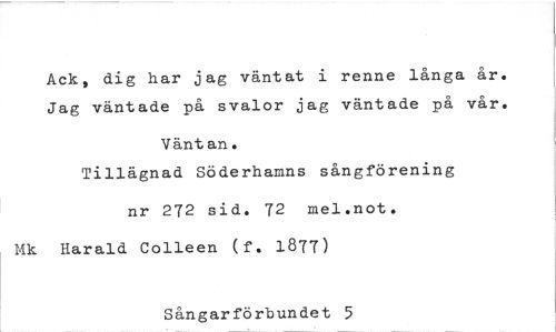 //// Ack, dig har jag väntat i renne långa år. Jag väntade på svalor jag väntade på vår. //// Väntan. //// Tillägnad Söderhamns sångförening //// nr 272 sid. 72 mel.not. Mk Harald Colleen (f. 1877) //// Sångarförbundet 5 ////