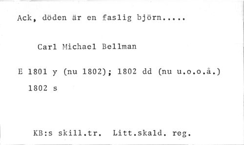 //// Ack, döden är en faslig björn //// Carl Michael Bellman //// E 1801 y (nu 1802); 1802 dd (nu u.o.o.å.) 1802 s //// KB:s skill.tr. Litt.skald. reg. ////