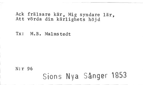 //// Ack frälsare kär, Mig syndare lär, Att vörda din kärlighets höjd //// Tx: M.B. Malmstedt //// N:r 96 //// Sions Nya Sånger 1953 ////