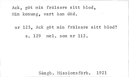 //// Ack, göt min frälsare sittblod, Min konung, vart han död. //// nr 123, Ack göt min frälsare sitt blod? s. 129 mel. som nr 112. //// Sängb. Missionsförb. 1921 ////