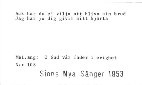 //// Ack har du ej vilja att bliva min brud Jag har ju dig givit mitt hjärta //// Mel.ang: 0 Gud vår fader i evighet N:r 108 //// Sions Nya Sånger 1853 ////