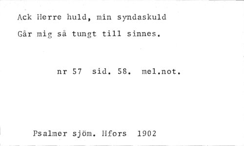 //// Ack Herre huld, min syndaskuld Går mig sä tungt till sinnes. //// nr 57 sid. 58. mel.not. //// Psalmer sjöm. Hfors 1902 ////
