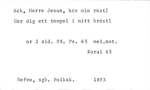 //// Ack, Herre Jesus, hör min röst! Gör dig ett tempel i mitt bröst! //// nr 2 sid. 98. Ps. 63 mel.not. //// Koral 63 //// Sefve, sgb. Folksk. 1893 ////
