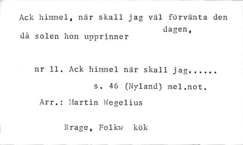 //// Ack himmel, när skall jag väl förvänta den //// då solen hon upprinner dagen, //// nr 11. Ack himmel när skall jag //// s. 46 (Nyland) mel.not. Arr.: Martin Wegelius //// Brage, Folkvy kök ////