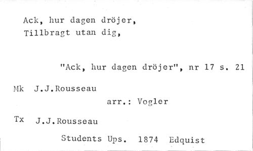 //// Ack, hur dagen dröjer, Tillbragt utan dig, //// "Ack, hur dagen dröjer", nr 17 s. 21 //// Mk J.J.Rousseau //// arr.: Vogler //// Tx J.J.Rousseau //// Students Ups. 1874 Edquist ////
