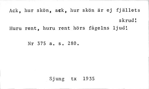 //// Ack, hur skön, ack, hur skön är ej fjällets //// skrud! //// Huru rent, huru rent hörs fågelns ljud: //// Nr 375 a. s. 280. //// Sjung tx 1935 ////