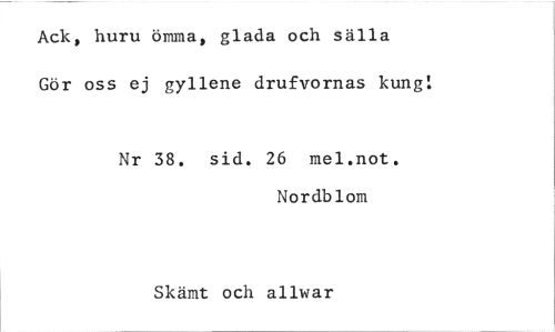 //// Ack, huru ömma, glada och sälla //// Gör oss ej gyllene drufvornas kung! //// Nr 38. sid. 26 mel.not. //// Nordblom //// Skämt och allwar ////