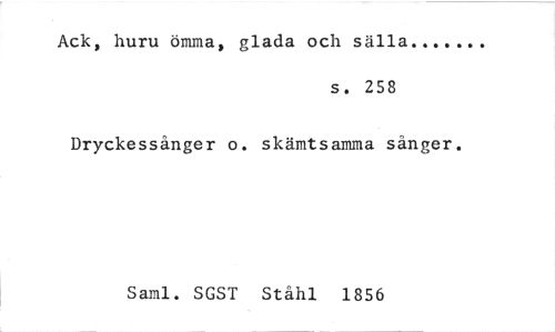 //// Ack, huru ömma, glada och sälla //// s. 258 //// Dryckessånger o. skämtsamma sånger. //// Saml. SGST Ståhl 1856 ////