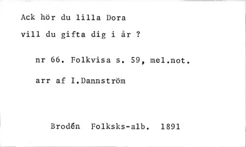 //// Ack hör du lilla Dora vill du gifta dig i år ? //// nr 66. Folkvisa s. 59, mel.not. arr af I.Dannström //// BroUn Folksks-alb. 1891 ////
