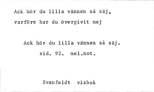 //// Ack hör du lilla vännen så säj, varföre har du övergivit mej //// Ack hör du lilla vännen så säj. //// sid. 92. mel.not. //// Svanfeldt visbok ////