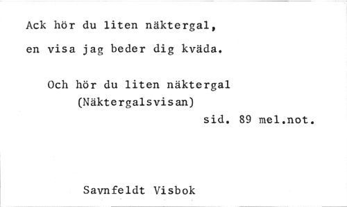 //// Ack hör du liten näktergal, en visa jag beder dig kväda. //// Och hör du liten näktergal (Näktergalsvisan) //// sid. 89 mel.not. //// Savnfeldt Visbok ////