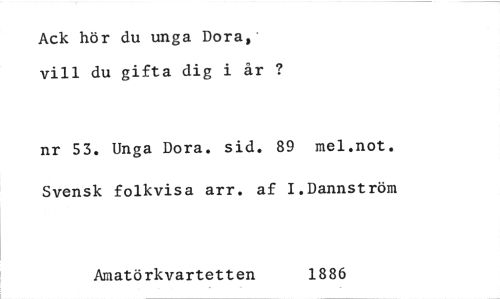 //// Ack hör du unga Dora,' vill du gifta dig i år ? //// nr 53. Unga Dora. sid. 89 mel.not. //// Svensk folkvisa arr. af I.Dannström //// Amatörkvartetten 1886 ////