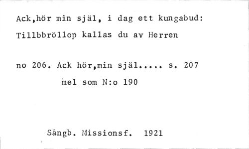 //// Ack,hör min själ, i dag ett kungabud: Tillbbröllop kallas du av Herren //// no 206. Ack hör,min själ s. 207 //// mel som N:o 190 //// Sångb. Missionsf. 1921 ////