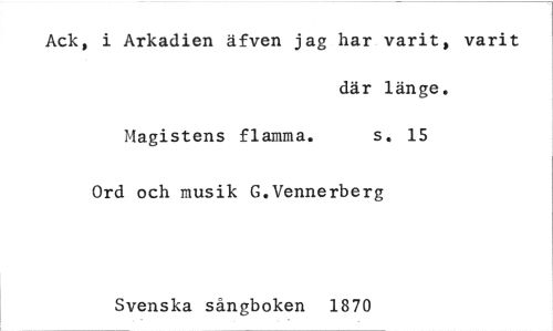 //// Ack, i Arkadien äfven jag har varit, varit //// där länge. //// Magistens flamma. s. 15 //// Ord och musik G.Vennerberg //// Svenska sångboken 1870 ////