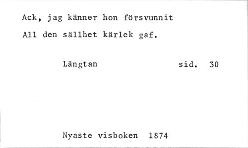//// Ack, jag känner hon försvunnit All den sällhet kärlek gaf. //// Längtan sid. 30 //// Nyaste visboken 1874 ////