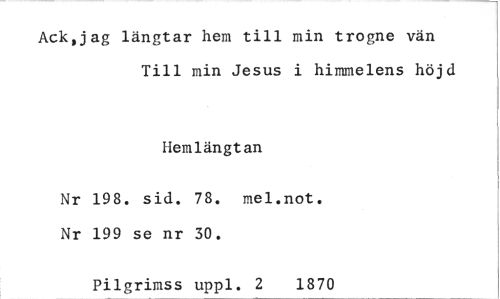 //// Ack,jag längtar hem till min trogne vän Till min Jesus i himmelens höjd //// Hemlängtan //// Nr 198. sid. 78. mel.not. Nr 199 se nr 30. //// Pilgrimss uppi. 2 1870 ////