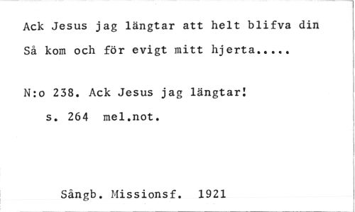 //// Ack Jesus jag längtar att helt blifva din //// Så kom och för evigt mitt hjerta //// N:o 238. Ack Jesus jag längtar: s. 264 mel.not. //// Sångb. Missionsf. 1921 ////