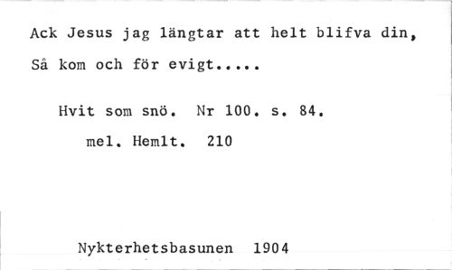 //// Ack Jesus jag längtar att helt blifva din, //// Så kom och för evigt //// Hvit som snö. Nr 100. s. 84. mel. Hemlt. 210 //// Nykterhetsbasunen 1904 ////