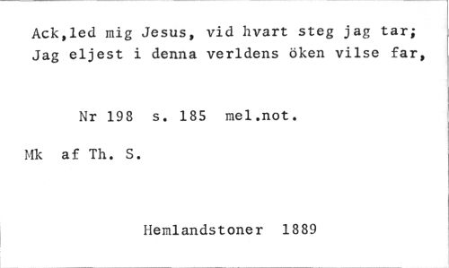 //// Ack,led mig Jesus, vid hvart steg jag tar; Jag eljest i denna verldens öken vilse far, //// Nr 198 s. 185 mel.not. //// Mk af Th. S. //// Hemlandstoner 1889 ////