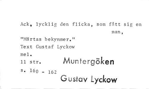 //// Ack, lycklig den flicka, som fått sig en //// man, "Märtas bekymmer." Text Gustaf Lyckow mel. //// 11 str. Mun te rgöken //// s. 160 - 162 Gustav L Lyckow ////