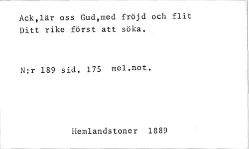 //// Ack,lär oss Gud,med fröjd och flit Ditt rike först att söka. //// N:r 189 sid. 175 mel.not. //// Hemlandstoner 1889 ////