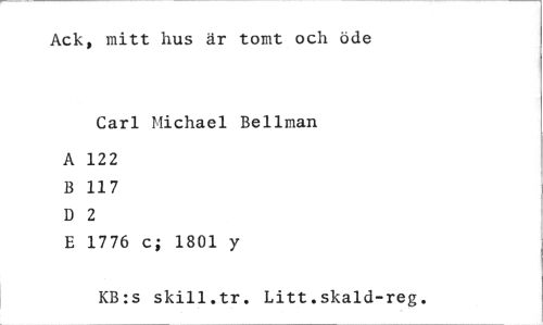 //// Ack, mitt hus är tomt och öde //// Carl Michael Bellman //// A 122 //// B 117 //// D 2 //// E 1776 c; 1801 y //// KB:s skill.t . Litt.skald-reg. ////