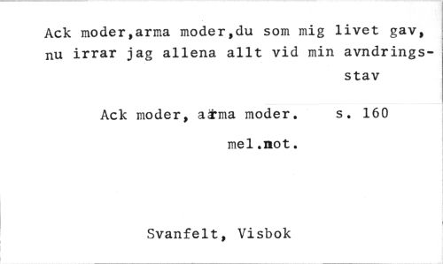 //// Ack moder,arma moder,du som mig livet gav, nu irrar jag allena allt vid min avndrings- //// stav //// Ack moder, aåma moder. s. 160 //// mel.not. //// Svanfelt, Visbok ////