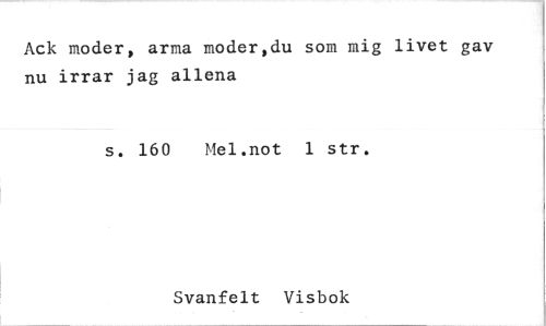 //// Ack moder, arma moder,du som mig livet gav nu irrar jag allena //// s. 160 Mel.not 1 str. //// Svanfelt Visbok ////