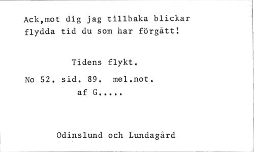 //// Ack,mot dig jag tillbaka blickar flydda tid du som har förgått! //// Tidens flykt. //// No 52. sid. 89. mel.not. //// af G //// Odinslund och Lundagård ////