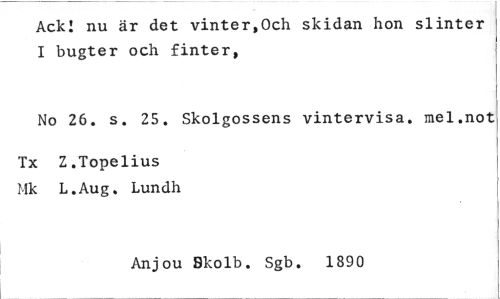 //// Ack! nu är det vinter,Och skidan hon slinter I bugter och finter, //// No 26. s. 25. Skolgossens vintervisa. mel.not //// Tx Z.Topelius 1Ik L.Aug, Lundh //// Anjou Kolb. Sgb. 1890 ////