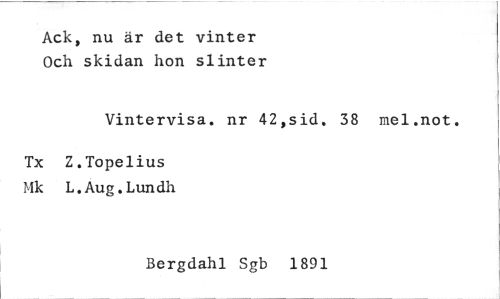 //// Ack, nu är det vinter Och skidan hon slinter //// Vintervisa. nr 42,sid. 38 mel.not. //// Tx Z.Topelius Mk L.Aug.Lundh //// Bergdahl Sgb 1891 ////