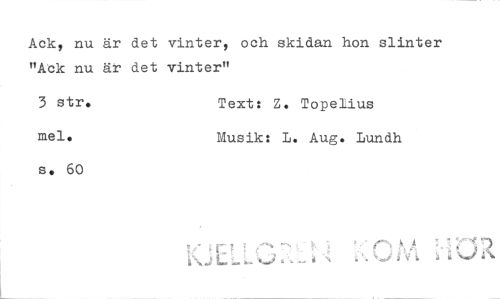 //// Ack, nu är det vinter, och skidan hon slinter "Ack nu är det vinter" //// 3 str. Text: Z. TopeLius //// mel. Musik: L. Aug. Lundh //// s. 60 ////