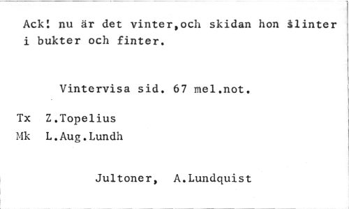 //// Ack! nu är det vinter,och skidan hon Vinter i bukter och finter. //// Vintervisa sid. 67 mel.not. //// Tx Z.Topelius Mk L.Aug.Lundh //// Jultoner, A.Lundquist ////