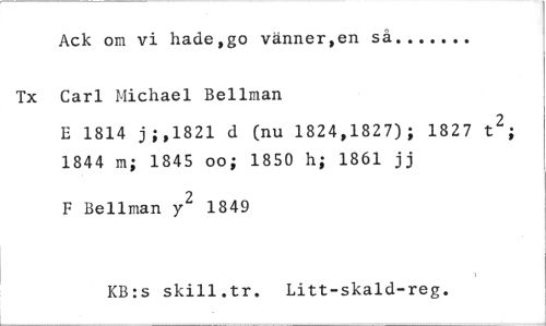 //// Ack om vi hade,go vänner,en så //// Tx Carl Michael Bellman //// E 1814 j;,1821 d (nu 1824,1827); 1827 t2; 1844 m; 1845 00; 1850 h; 1861 jj //// F Bellman y2 1849 //// KB:s skill.tr. Litt-skald-reg. ////