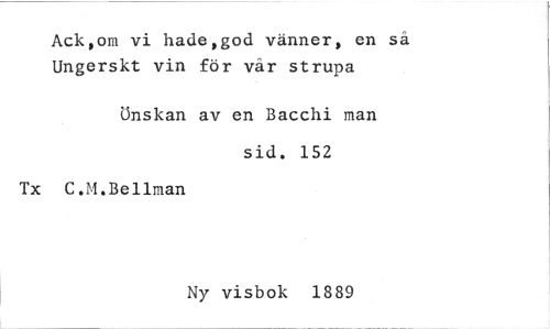 //// Ack,om vi hade,god vänner, en så Ungerskt vin för vår strupa //// Önskan av en Bacchi man //// sid. 152 //// Tx C.1.Bellman //// Ny visbok 1889 ////
