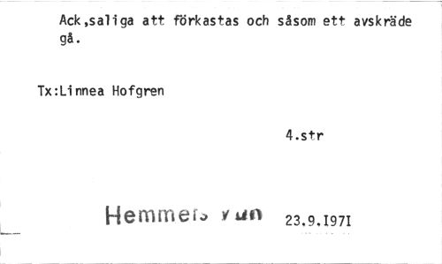 //// Ack,saliga att förkastas och såsom ett avskräde gå. //// Tx:Linnea Hofgren //// 4.str //// Hemme v Lin 23.9.1971 ////
