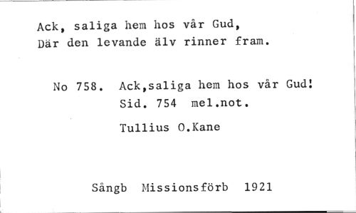 //// Ack, saliga hem hos vår Gud, //// Där den levande älv rinner fram. //// No 758. Ack,saliga hem hos vår Gud! //// Sid. 754 mel.not. //// Tullius O.Kane //// Sångb Missionsförb 1921 ////