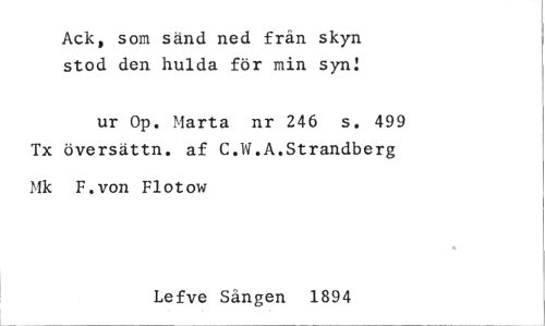 //// Ack, som sänd ned från skyn //// stod den hulda för min syn: //// ur Op. Marta nr 246 s. 499 Tx översättn. af C.W.A.Strandberg //// Mk F.von Flotow //// Lefve Sången 1894 ////