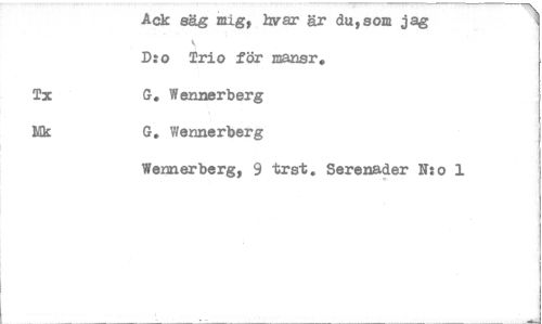 //// Ack säg mig, byar är du,som jag D:o Trio för mansr. //// Ta G. Wennerberg //// båk G. Wennerberg //// Wennerberg, 9 tryt. Serenader 17:o 1 ////