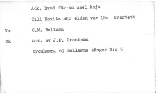 //// Adk, kvad för-en usel koja //// Till Movitz när elden var lös kvartett //// C.M. Bellman //// arr. av J.P. Cronhamn //// Cronhmn, 60 Bellman sånger N:o 5 //// Tx //// Mk ////