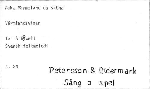 //// Ack, Värmeland du sköna //// Värmlandsvisan //// Tx A Rhell //// Svensk folkmelodi //// s. 24 Petersson g Oldermarbt //// Sång o spel ////