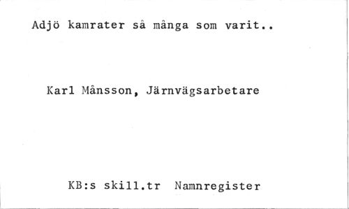 //// Adjö kamrater så många som varit.. //// Karl Månsson, Järnvägsarbetare //// KB:s skill.tr Namnregister ////