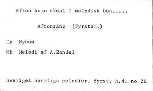 //// Afton huru skön: I melodisk bön //// Aftonsäng (Fyrstäm.) //// Tx Nybom //// Mk Melodi af A.Randel //// Sveriges herrliga melodier. fyrst. h.4. no 25 ////