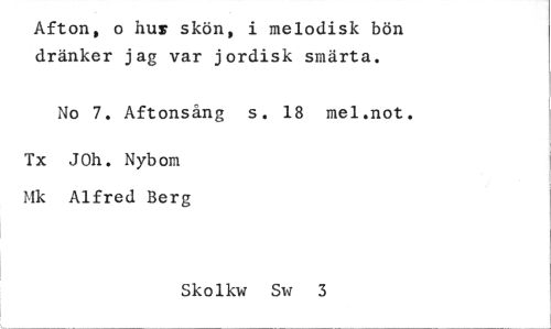 //// Afton, o hus skön, i melodisk bön dränker jag var jordisk smärta. //// No 7. Aftonsång s. 18 mel.not. //// Tx JOh. Nybom Mk Alfred Berg //// Skolkw Sw 3 ////