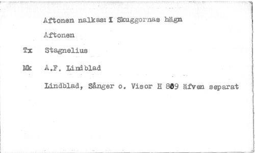 //// Aftonen nalkas:1 Skuggornas hägn Aftonen //// Tx Stagnelius //// Mk A.F. Lindblad //// Lindblad, Sånger o. Visor H 809 äfven separat ////