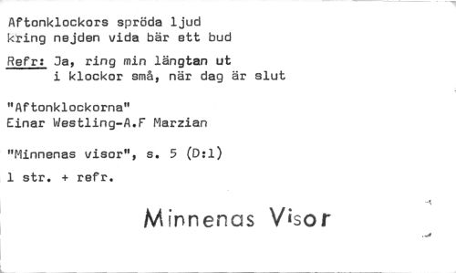 //// Aftonklockors spröda ljud kring nejden vida bär ett bud //// Refr: Ja, ring min längtan ut //// i klockor små, när dag är slut //// "Aftonklockorna" //// Einar Westling-A.F Marzian //// "Minnenas visor", s. 5 (D:1) 1 str. + refr. //// Minnenas Visor ////