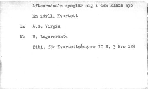 //// Aftonrodna'n speglar sig i den klara sjö //// En idyll. Kvartett //// Tx A.G. Virgin //// fåk W, Lagercrantz //// Bibi. för Kvartettsångare II H. 3 N:o 129 ////