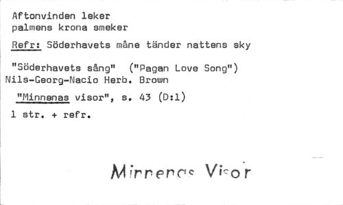 //// Aftonvinden leker palmens krona smeker //// Refr: Söderhavets måne tänder nattens sky //// "Söderhavets sång" ("Pagan Love Song") Nils-Georg-Nacio Herb. Brown //// "Minnenas visor", B. 43 (D:1) 1 str. + refr. //// M -r-r erre Vi-or ////